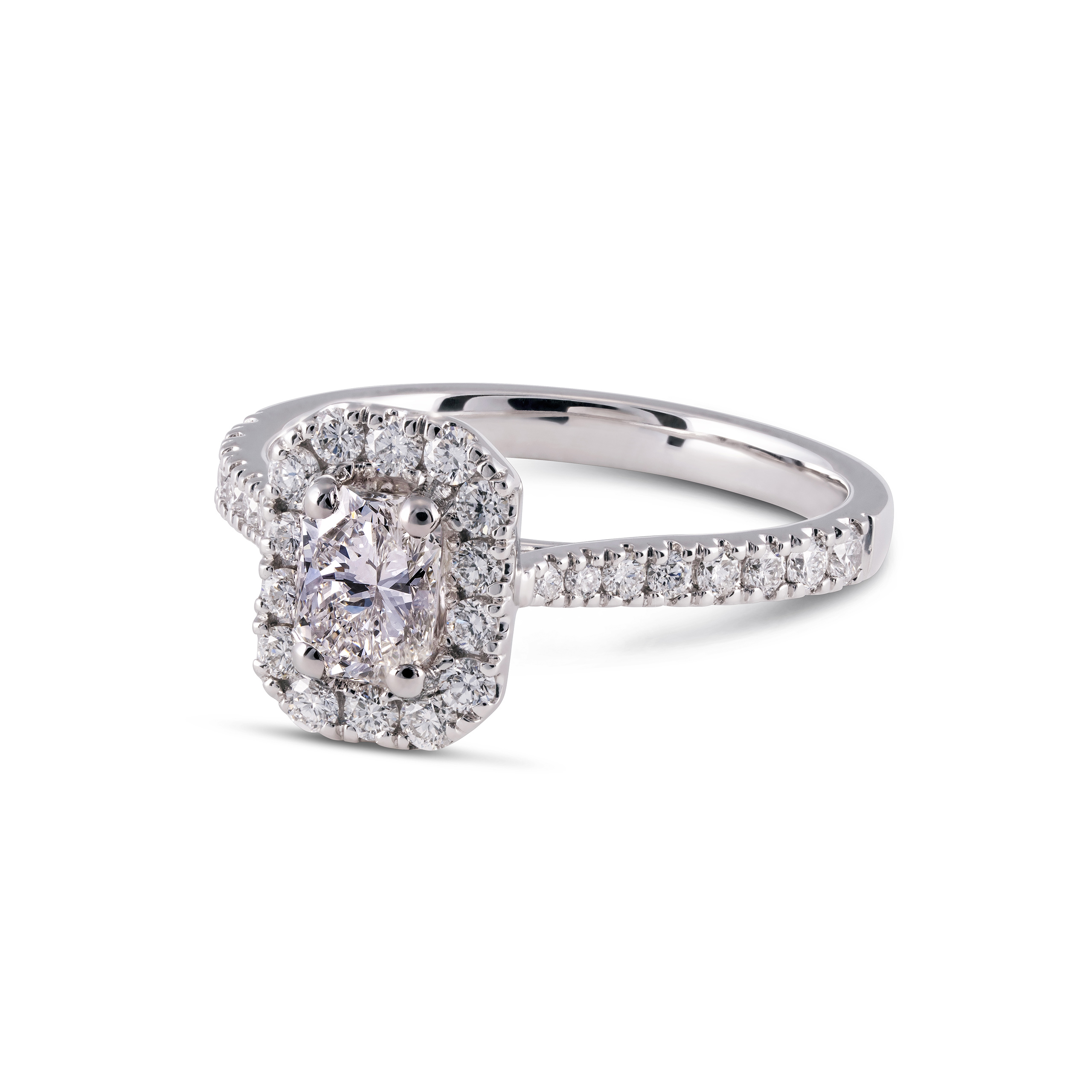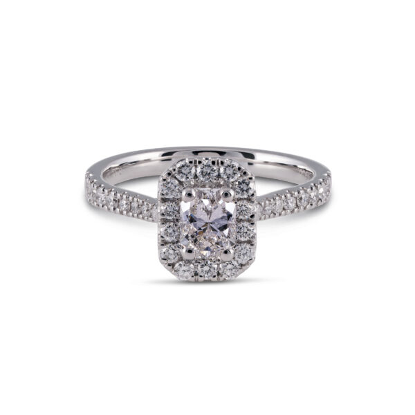Our Atlantis Engagement Ring has a radiant cut diamond with round brilliant cut diamonds on the halo and band.