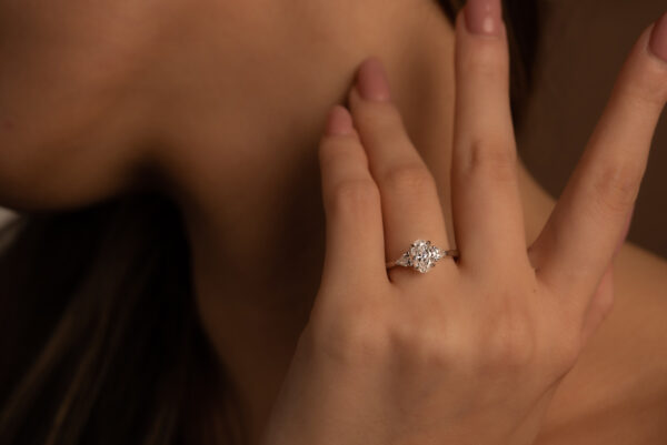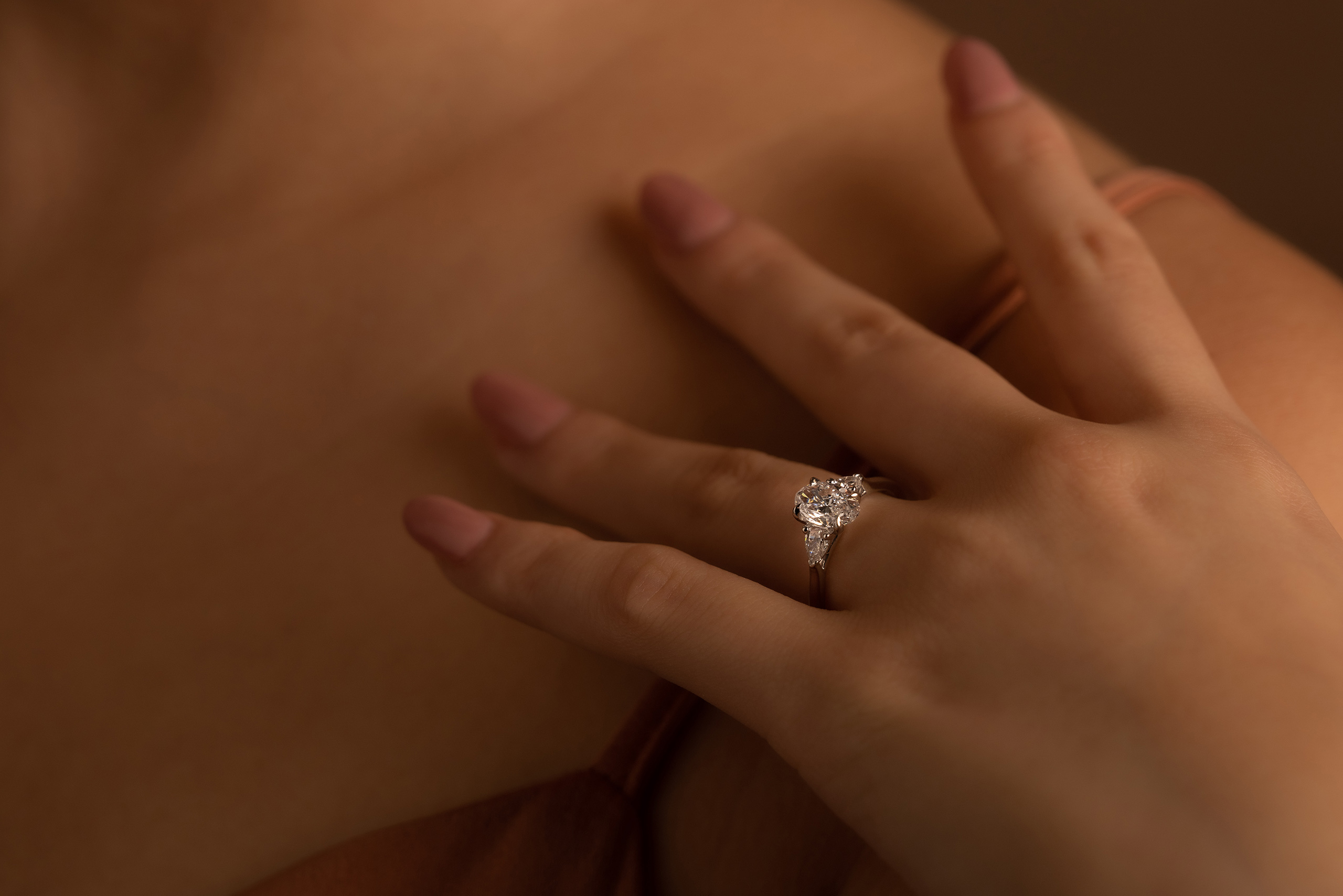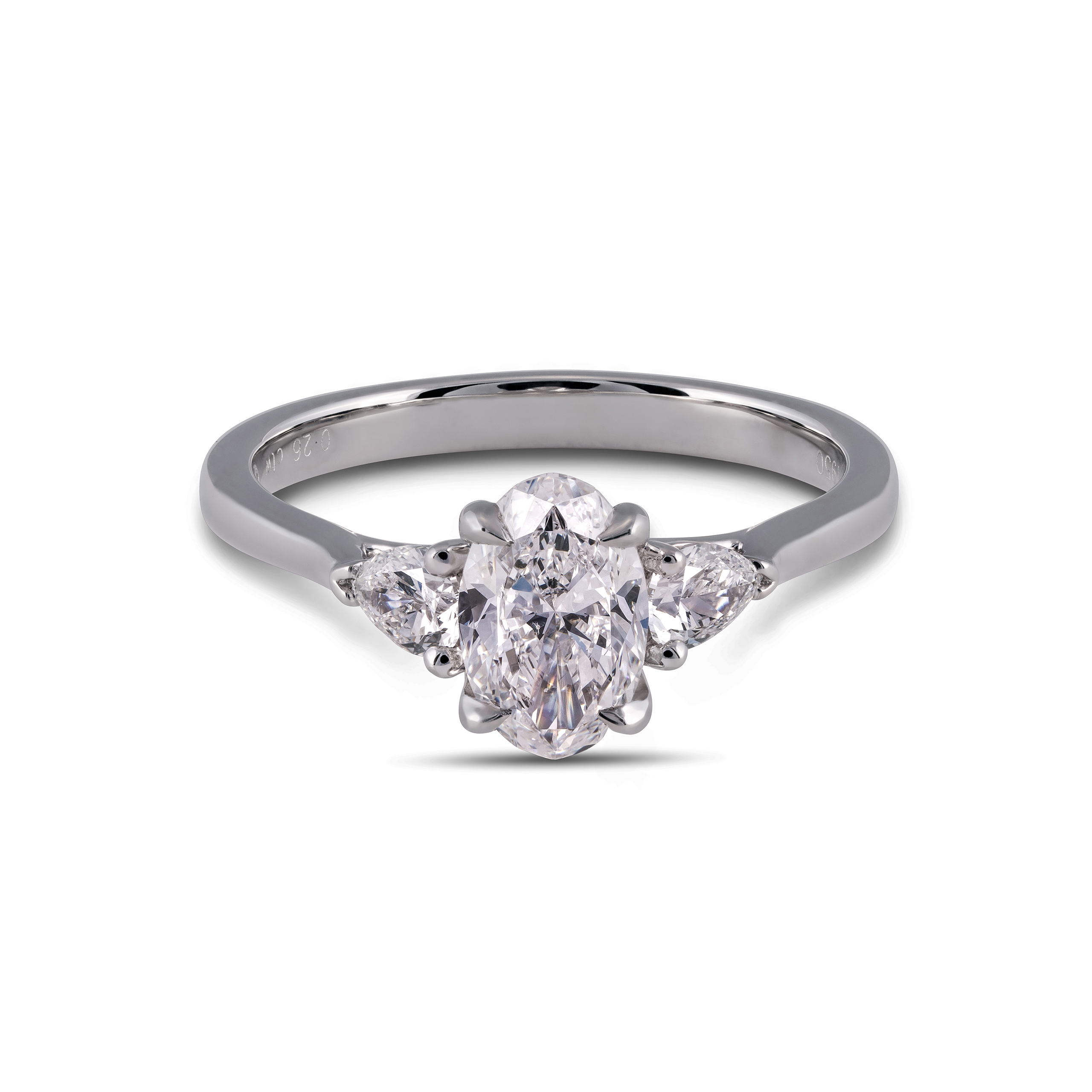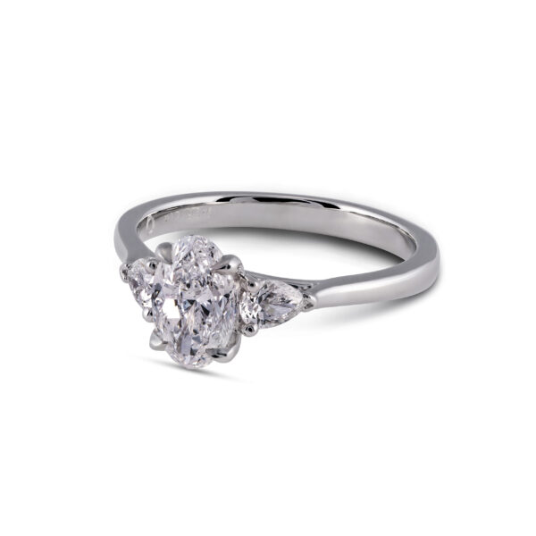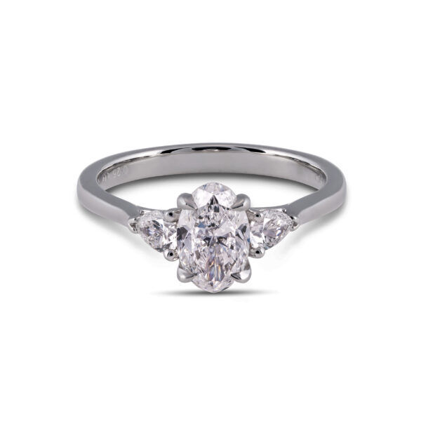 Our Auris Engagement Ring has an oval diamond with 2 pear shape diamonds on the side.