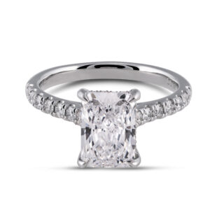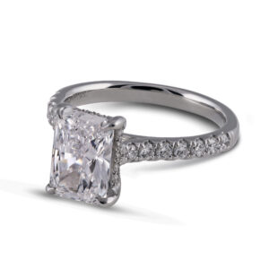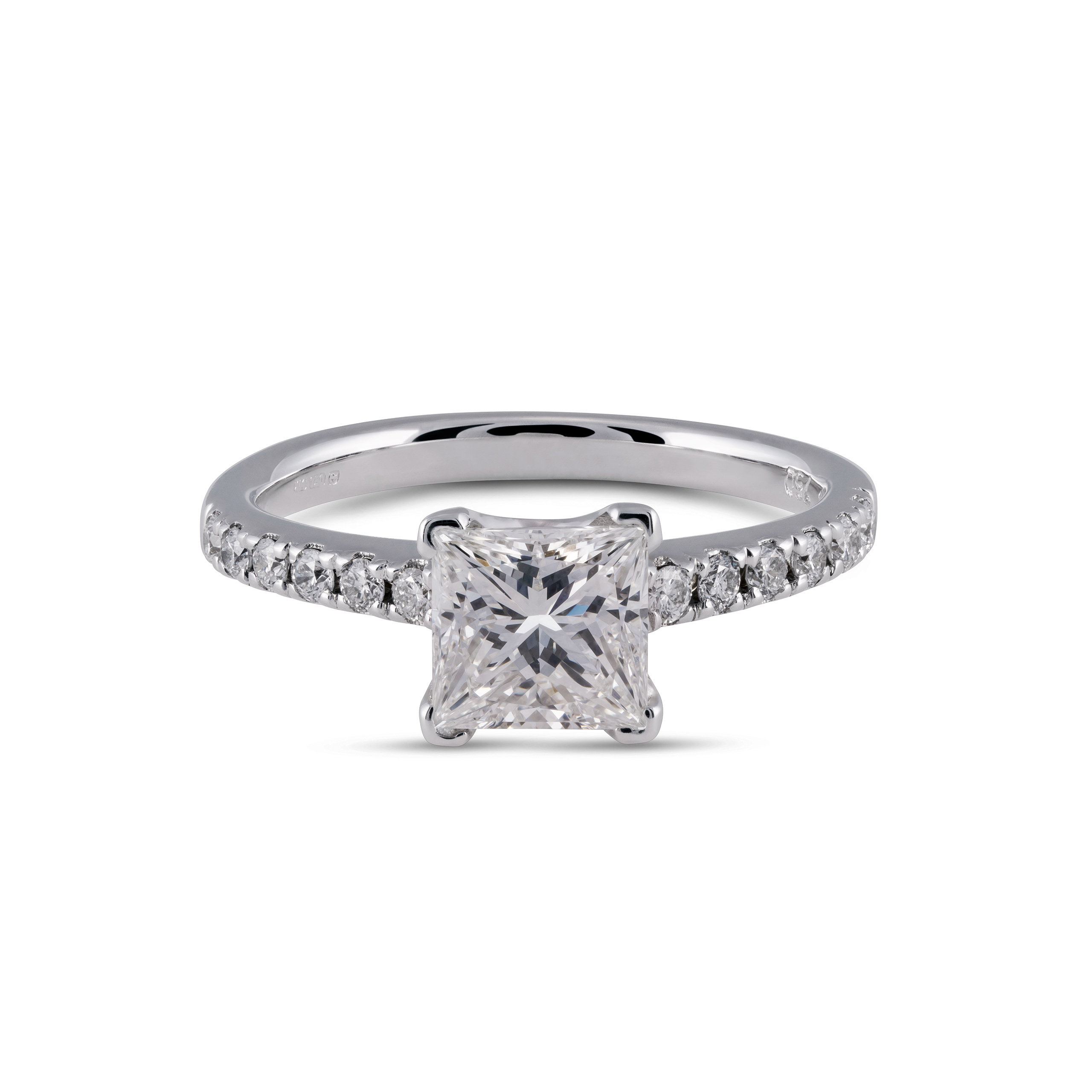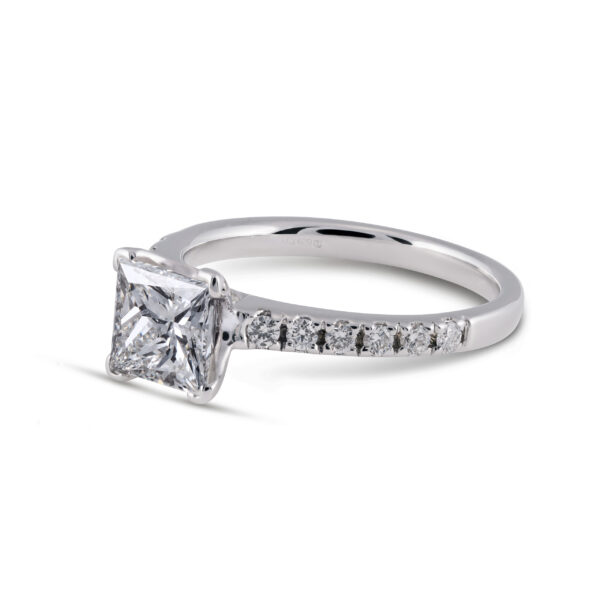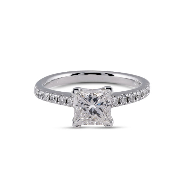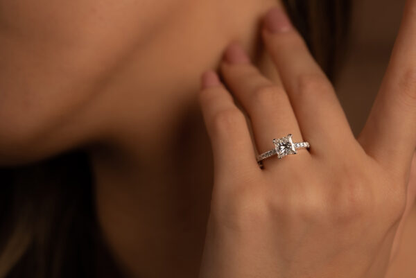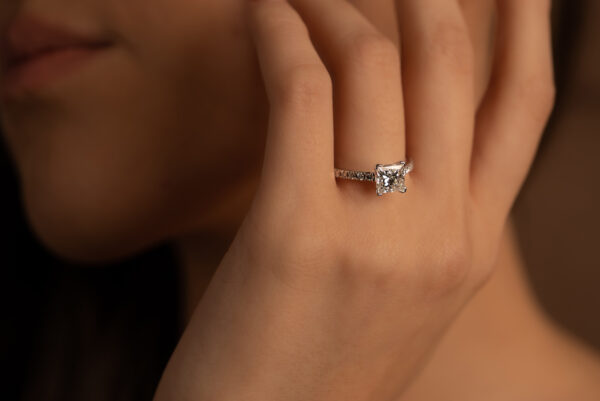 Our Belis Engagement Ring has a princess cut with round diamonds on the band.