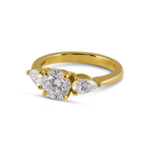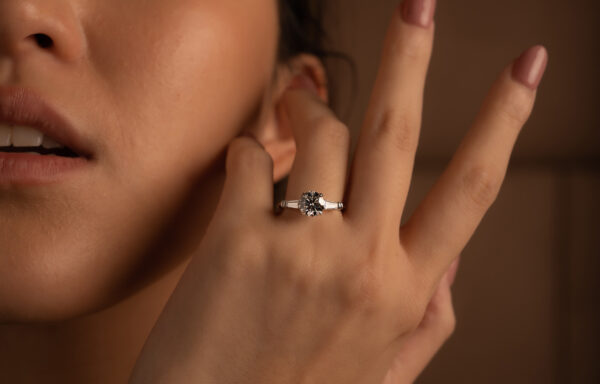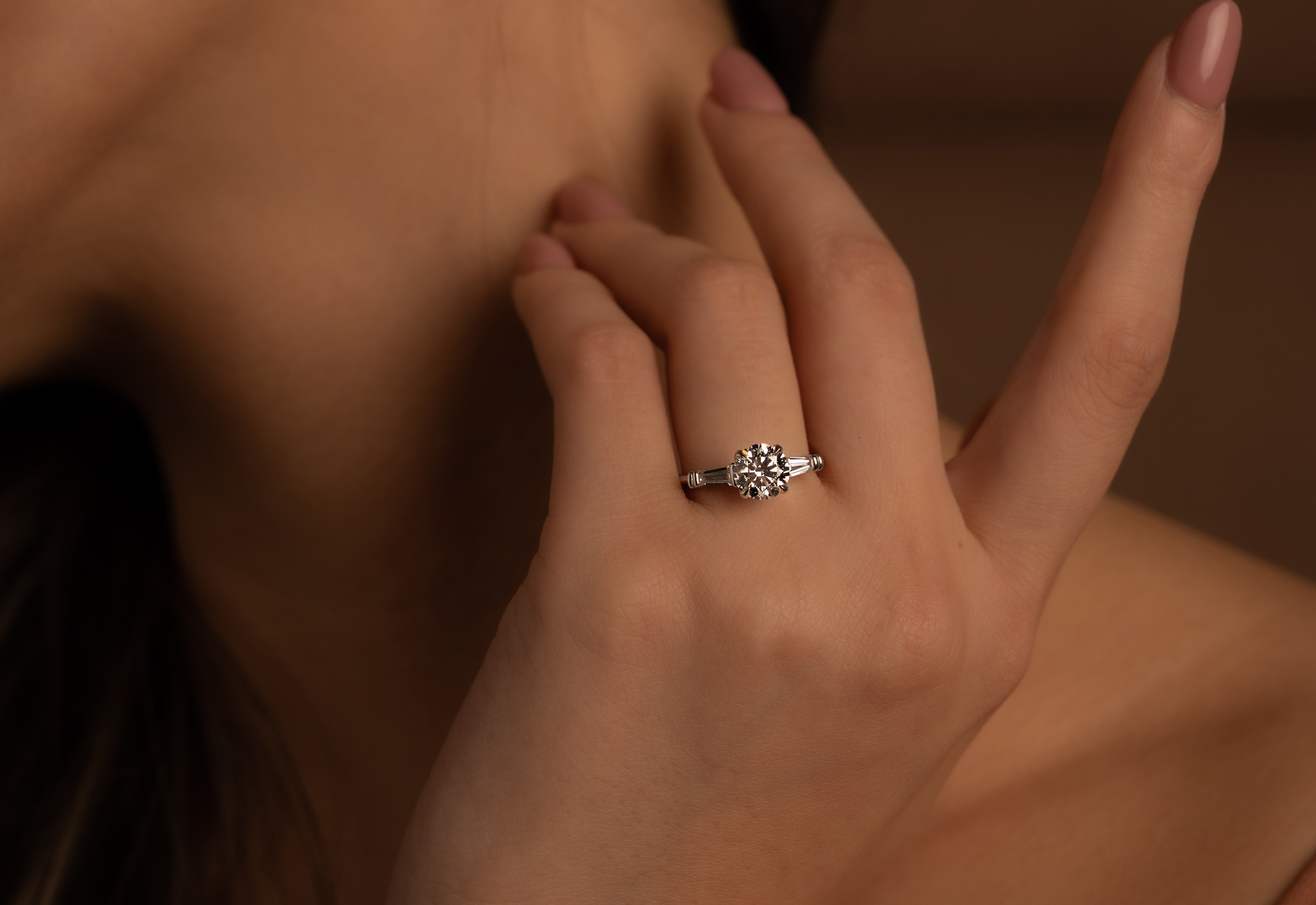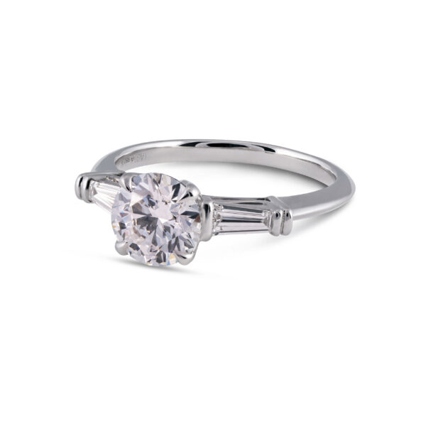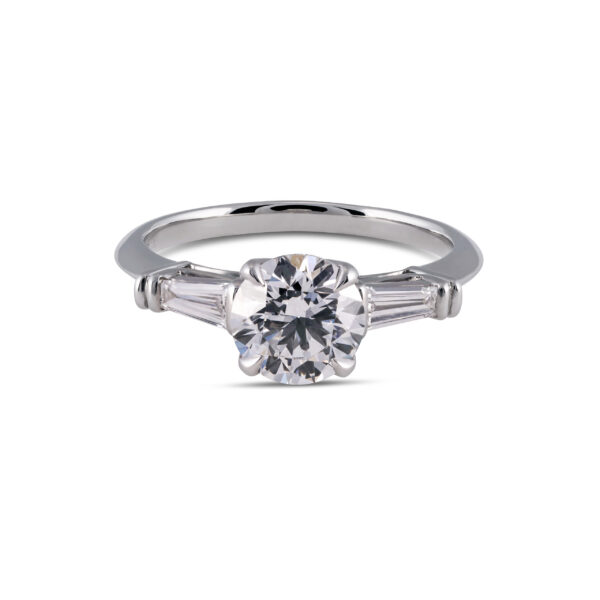 Our Florence Engagement Ring is made with a round brilliant cut diamond with matching tapered baguettes on the sides.