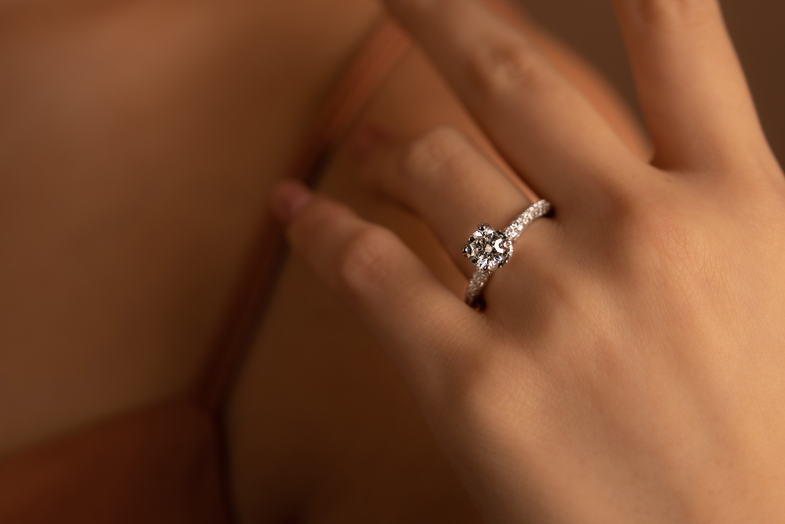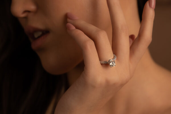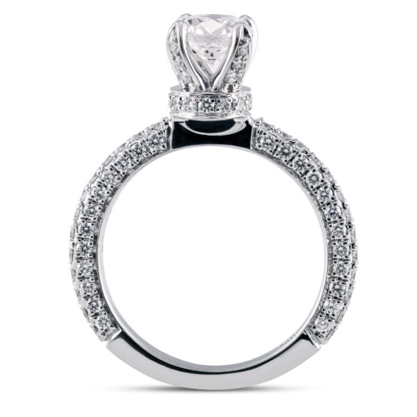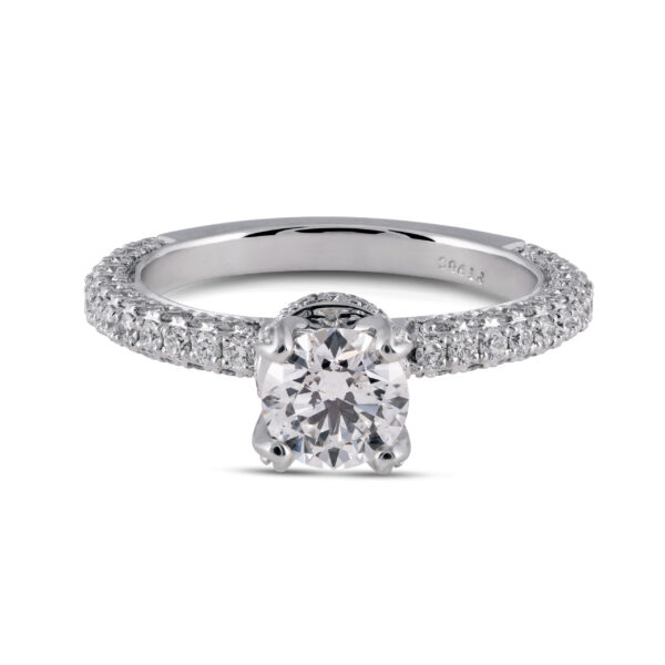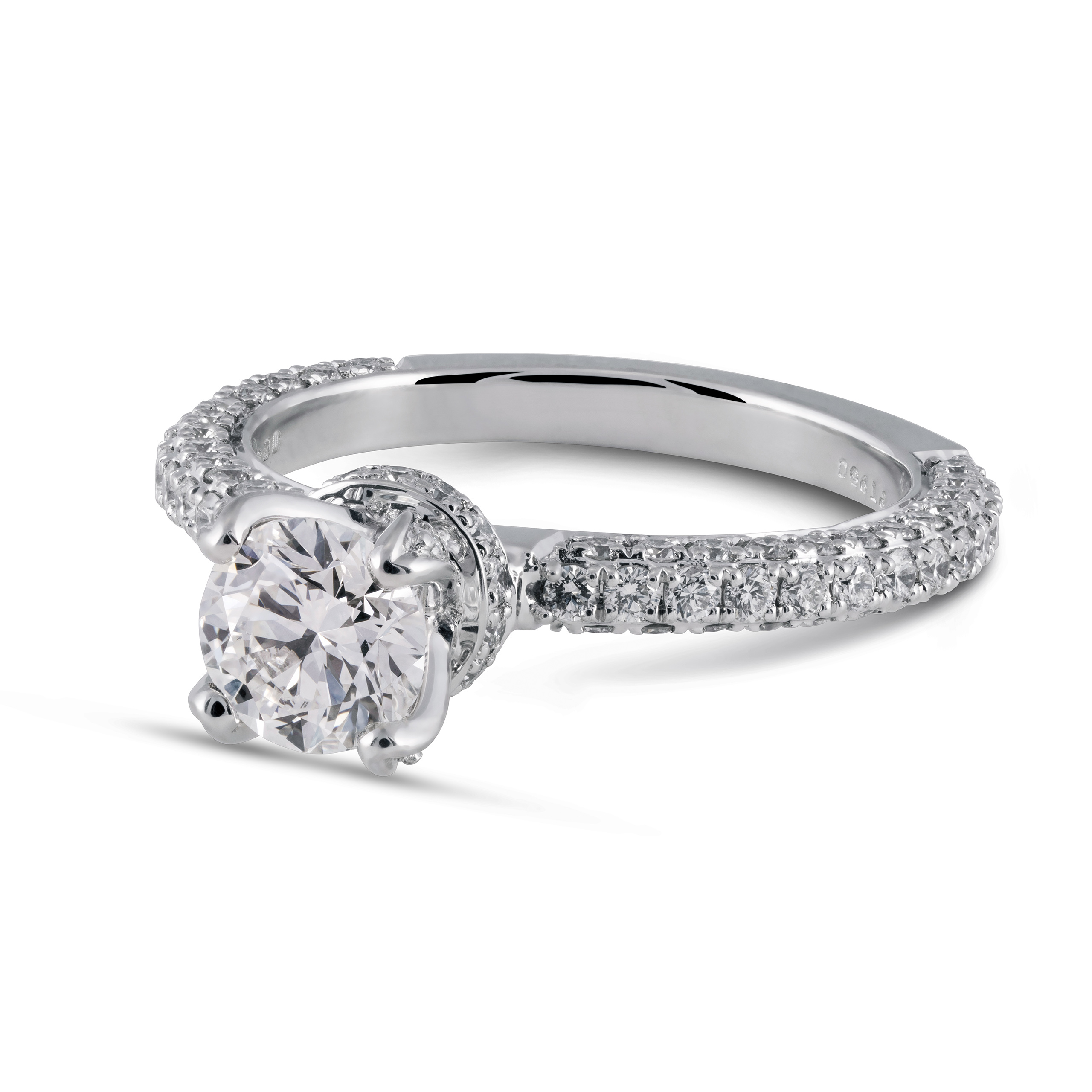 Our Francis Engagement Ring is made with a round brilliant cut diamond with diamonds on the halo and on the band.