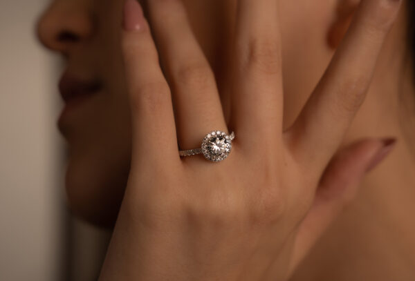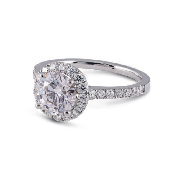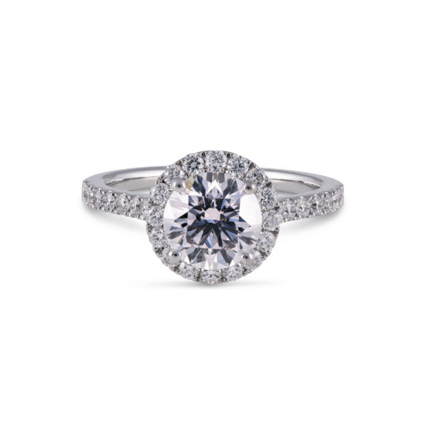 Our popular Lara Engagement Ring is a round brilliant cut diamond with diamonds on the halo and shoulders.