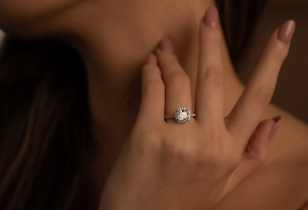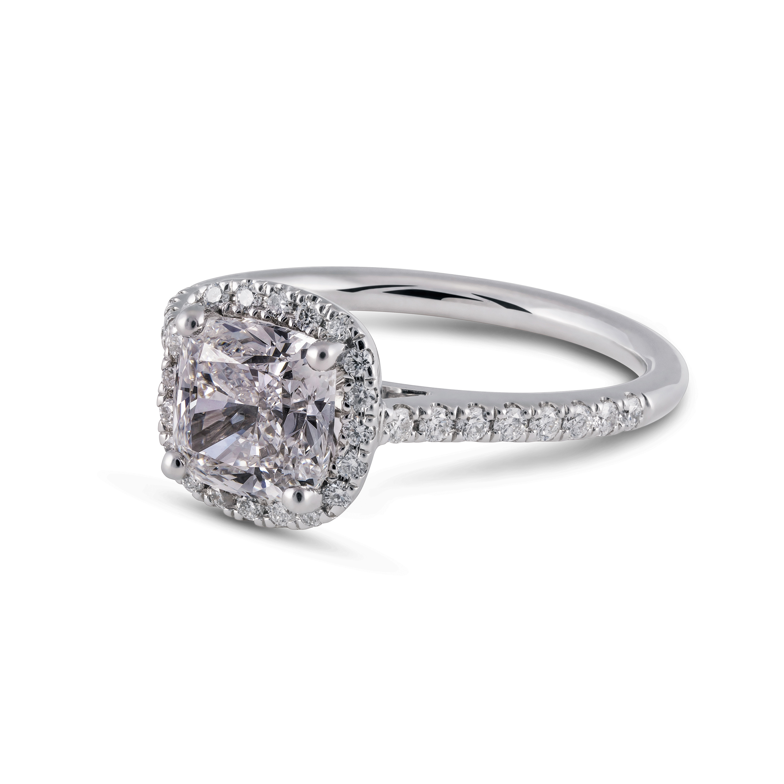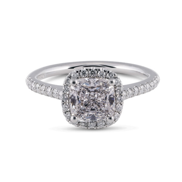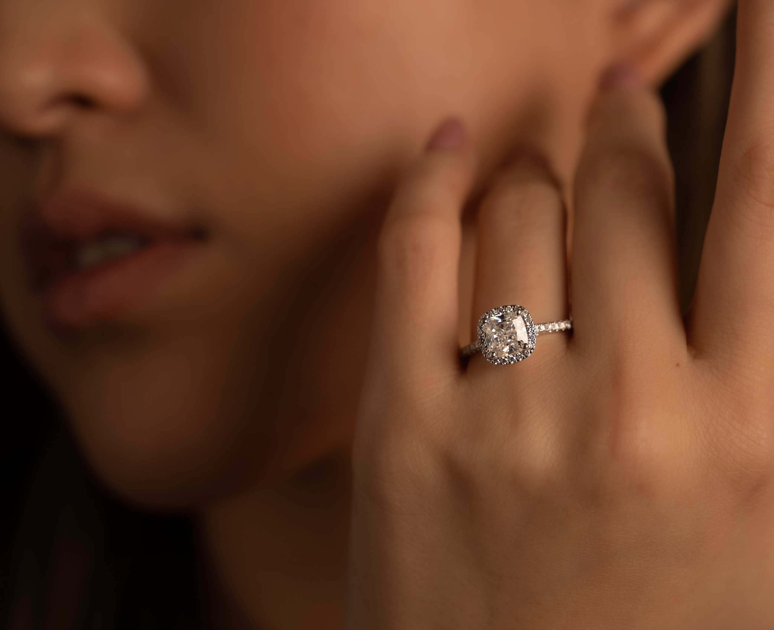 Our classic Reeva Engagement Ring has a stunning cushion cut diamond with round diamonds on the band and on the halo.