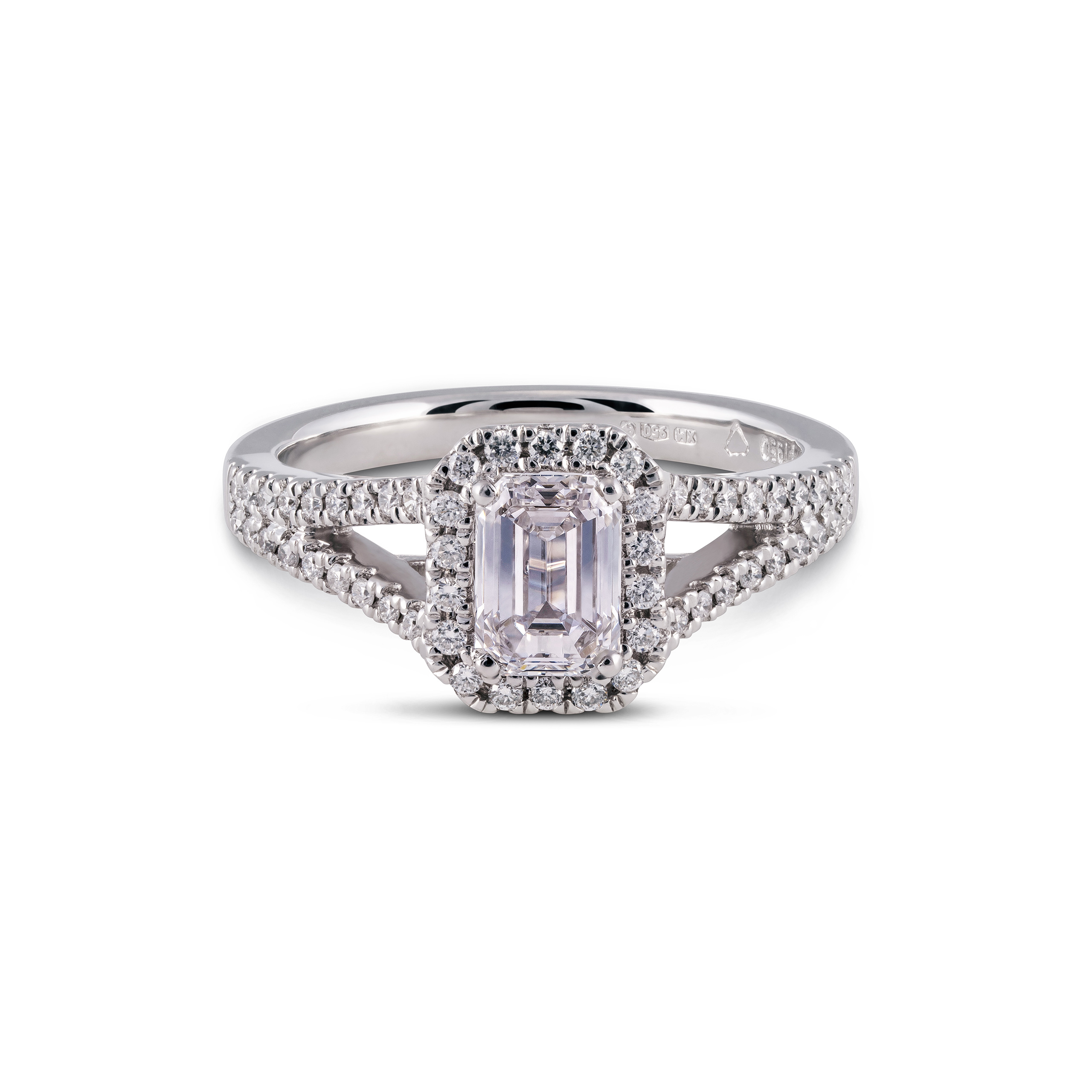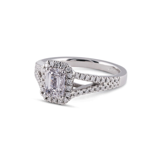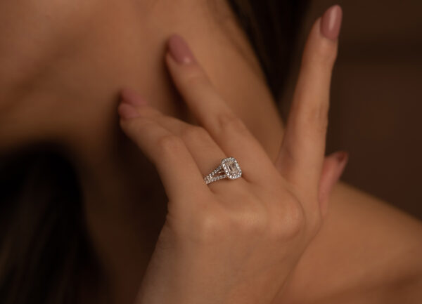 Our Sienna Engagement Ring has an emerald cut diamond with a split diamond set band.